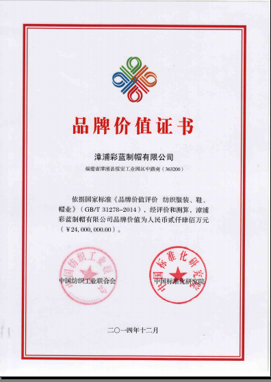 彩蓝制帽,帽饰行业品牌领导者,致力于打造精品帽饰。20年来,彩蓝制帽始终始终恪守高品质,坚持不懈的努力赢得了不少美誉。2015年9月23日,彩蓝制帽凭借着自己的品牌实力,再次荣誉加身——荣获2014中国纺织业品牌价值证书。