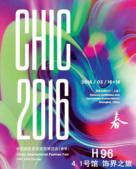 2016中国国际服装服饰博览会【CHIC2016春季】将于2016年3月16-18日,继续在上海虹桥“国家会展中心(上海)”举办。2016年CHIC,日本总公司将与彩蓝公司联合参展,届时将有更多展品及更多款式与大家见面,设计的火花将在此届展会上熠熠生辉。