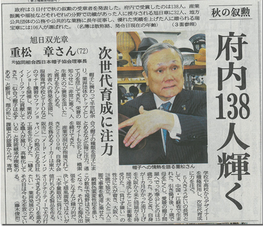 2016年11月3日,日本天皇在皇宫代表日本政府和人民向重松章先生授予【旭日双光勋章】,以表彰其多年来对日本帽子行业所做出的卓越贡献。同日,重松章偕夫人共同出席了授勋仪式。